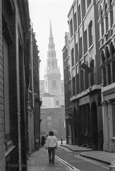 Pilgrim St and St Brides, 1974 3l-35: City, street, church, office, shop, Victorian, pre-Victorian