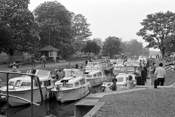 Penton Hook Lock, Spelthorne, Surrey, 1976 7q-33 : Spelthorne, Surrey, lock, boats, pre-Victorian, post-war