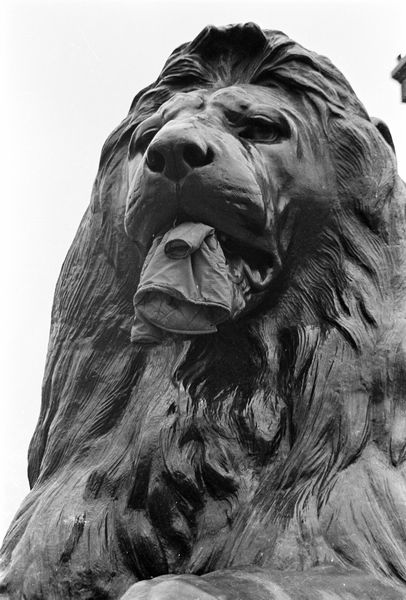 Lion with coat in mouth, Trafalgar Square, 1976 7t-55 : Westminster, lion, sculpture, Landseer, Victorian