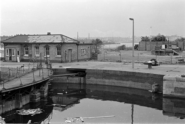 Surrey Docks Farm, Greenland Dock entrance, Rotherhithe, 1976 7v-51: Southwark, farm, dock, lock, Victorian,
