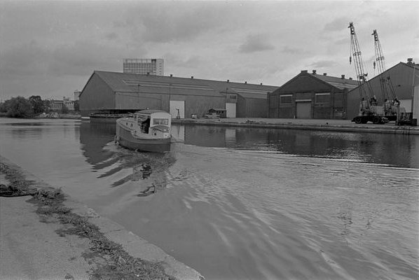 Grand Union Canal and sheds, Brentford, Middx, 1977 13d44: Hounslow, Middx, canal, boat, sheds, cranes,