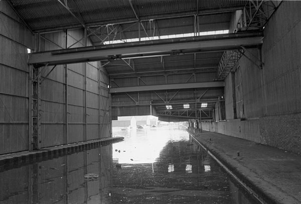 13d52: Hounslow, Middx, canal, boat, sheds, cranes,