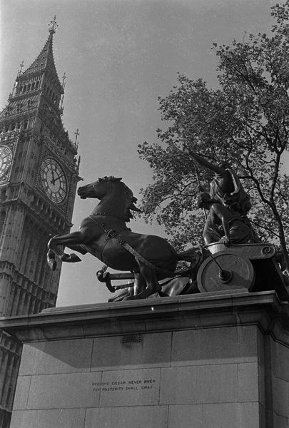 Boadicea and Her Daughters and the Elizabeth Tower (Big Ben), Westminster, 1977 13f21: Westminster, sculpture, Thornycroft, Big Ben, Houses of Parliament, Victorian,