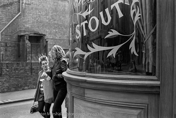 Pub window and people, Covent Garden, Westminster, 1978 14d53: westminster, pub, window, people