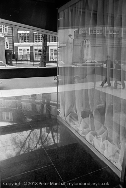 A rather more interesting reflection image, making use of a reflection in both a vertical glass window and a horizontal polished marble floor, with careful lining up which makes the unusual near-horizontal strip fence around the office appear to continue seen through the window when it and the cars, buildings and the couple are in fact reflections. The corner where this picture was taken has since been altered.