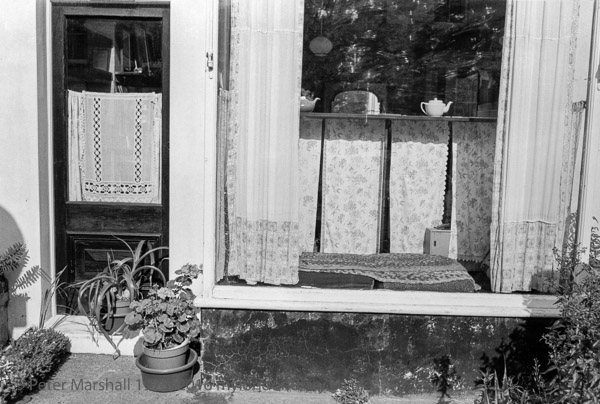 This has the look of a former shop converted into a home, with a slightly curious collection of curtains and other fabrics in different styles. The space at the front, apparently open to the street has been colonised by plants, some in pots, with one of these on the doorstep preventing entry, perhaps suggesting that this property has been combined with a neighbour.