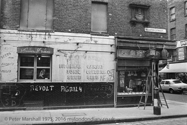 The house has been done up a bit since, the signage removed and a new door added with the window shuttered, while the first floor now has windows and curtains and appears occupied, and, like most surfaces around Brick Lane is now covered with graffiti. Back then there was relatively little graffiti, and the word 'REVOLT' really stood out, though the second word, which appears to be AGAIL4 is incomprehensible to me. Further to the right is a reminder that this area was close to Bethnal Green Road where the National Front used to come to sell their racist news sheets - and were sometimes involved in scuffles with anti-racists.