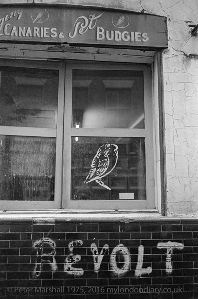 A closer view of a part of the wall, apparently inciting Canaries and Pet Budgies to revolt. Birds of the World Unite, you have nothing to lose but your perches