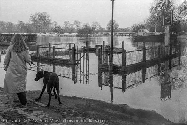 River Thames flooding at Twickenham, Richmond, 1979 18r-15: richmond, river thames, flood, pub, pub sign, White Swan, dog