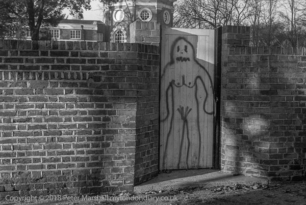 Taken on the same walk, this is a figure I photographed on several occasions, of which I think this is the best. Crudely drawn, something between a ghost and a human, it appeared to me as someone's scary phobia emerging from this locked gate.