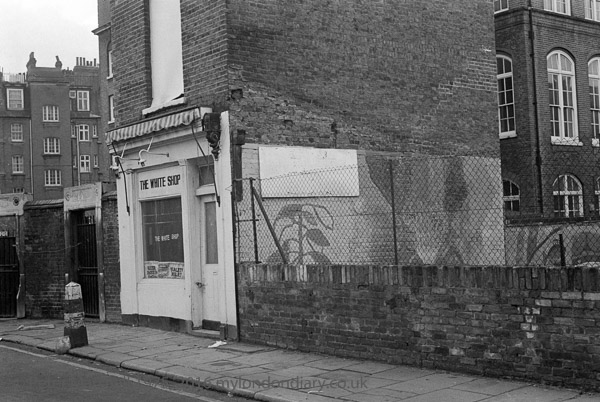 The White Shop at 6 Whidborne St is said to have been at one time the house of the headmistress of the Argyle Primary School which is at the right of the picture, though its small size and plain design makes it look more like a caretaker's house. Two school entrances (not now in use) at the left of the shop are still present. The school was built as Manchester Street School (this part of Argyle St was known as Manchester St until some time in the early 20th century) in 1880 and later had links with Mary Ward and the 1897 Passmore Edwards Settlement in Tavistock Place which provided after-school activities for poor children until their parents left work.