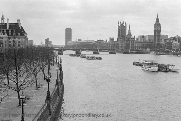 A second picture, taken closer to the South Bank, shows the Embankment well before the London Eye. County Hall, then still occupied by the GLC, faced the Houses of Parliament across the river, a few years before Margaret Thatcher's fit of pique put London's government into disarray which the city has still not quite recovered from.