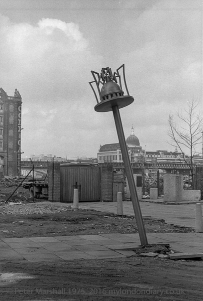Jubilee Walk marker post, Southwark, 1979 19i-23: warehouse,St Paul's Cathedral, bridge, wharf