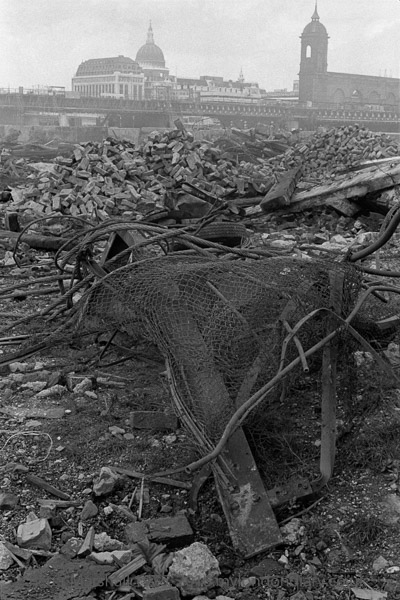 Demolition West Kent & Hibernia Wharves, Southwark, 1979 19i-33: rubble, St Paul's Cathedral, bridge, wharf, Hibernia, West Kent