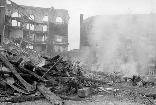 Demolition West Kent & Hibernia Wharves, Southwark, 1979 19i-46: rubble, Cannon St, bridge, wharf, Hibernia,