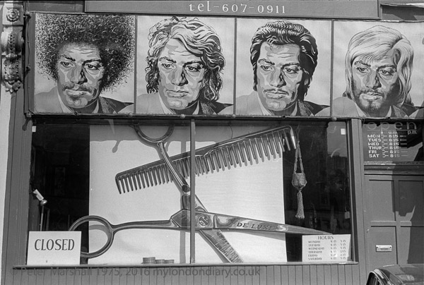 Hairdressers, Caledonian Rd, Islington, 1979 19x-44: shop, window, scissors, comb, hairdressers, barbers,