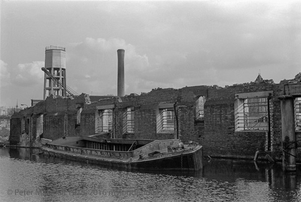 Coal Drop, regents Canal, Camden, 1979 19z-32: canal, demolition, coal drop, bridge, water tower,, barge