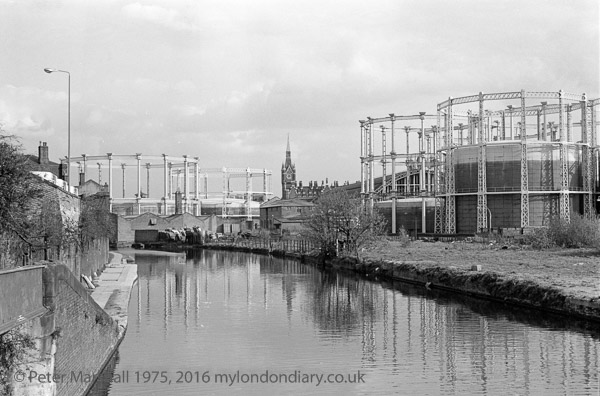 Regents Canal, Midland Hotel and gas holders, Camden, 1979 19z-53: canal, gas holders, hotel
