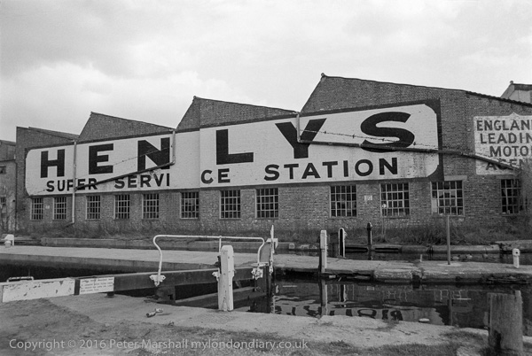 Henlys Service Station, Camden Lock, Regents Canal, Camden, 1979 20e-26: works, motor agency canal, lock,