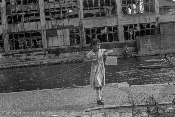 Girl fishing, Wharf Rd, Regents Canal, Hackney, 1979 20n-32: works, derelict, girl, canal, canoes