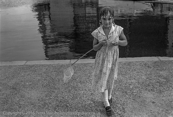 Girl fishing, Wharf Rd, Regents Canal, Islington, 1979