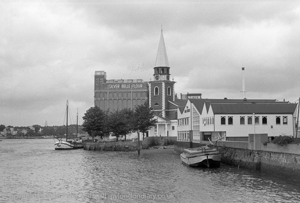 Silver Belle Flour and St Mary's Church, Battersea, Wandsworth, London 1979 21h-51: river, River Thames, church, flour mill, pub, The Old Swan, boat