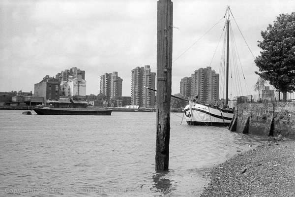 Worlds End and Chelsea Flour Mills from, Battersea, Wandsworth, London 1979 21h-56: river, River Thames, estate, flat, boat, flour mill,