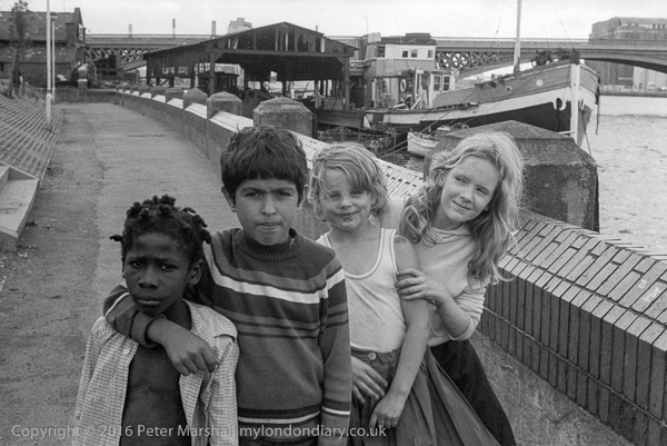 Children on Riverside Walk, Battersea, Wandsworth, London 1979 21h-66: river, River Thames, boat, mooring, children