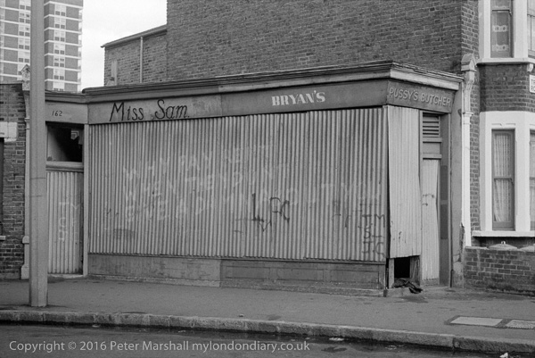 Miss Sam and Bryan's - Pussy's Butcher, Lansdowne Drive, Hackney, London 1979 21l-52: derelict, shop, house
