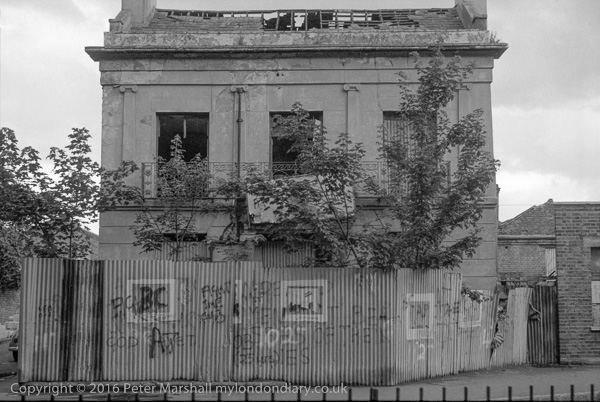 House undergoing refurbishment, Lansdowne Rd, London Fields, Hackney, 1979 21l-64: house, derelict, fence