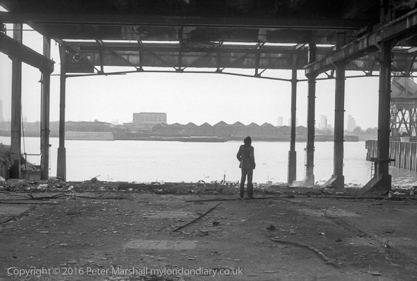 Disused wharf and River Thames, North Greenwich, Greenwich. 1980 24i-35: wharf, river, crane