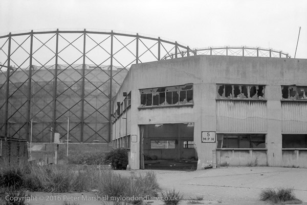 Disused Wharf and Gas holders, North Greenwich, Greenwich. 1980 24j-11: wharf, gas holders,