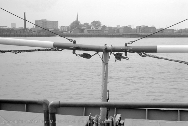 River Thames and Millwall from Riverside path, North Greenwich, Greenwich. 1980 24j-15: river, rigging