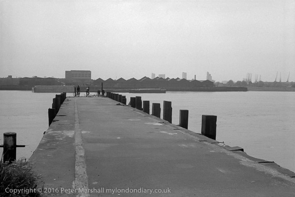 Pier, River Thames and view of Millwall, North Greenwich, Greenwich. 1980 24j-44: children, pier, river,,