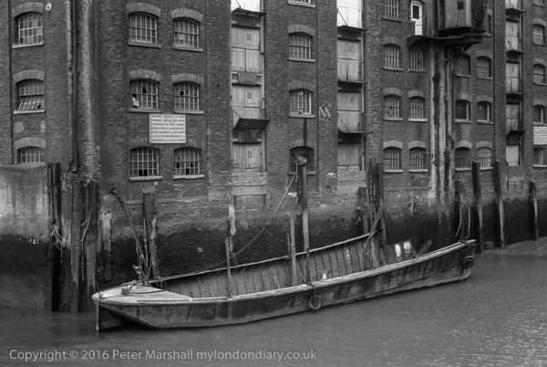 New Concordia Wharf, St Saviour's Dock, Bermondsey, Southwark. 1980 24m-41: boat, dock, warehouse,