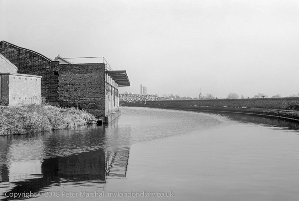 The building at left is I think still there beside the canal, set some way back from Hythe Road in an area now all occupied by Cargiant, "officially the world's largest used car dealership". The bridge in the distance is Mitre Bridge, also known as Scrubs Lane Bridge, which carries the Overground line from Clapham Junction to Willesden Junction, as well as goods traffic onto the main West Coast line. The bridge gets its name from the angle at which it crosses the canal.