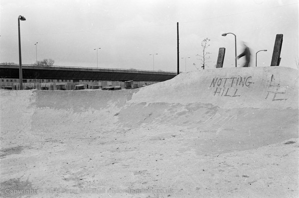In the background you can see a part of the elevated section of the Westway, which devastated a large swathe of land through the north of Notting Hill, where some of the poorest areas of London were demolished along its path with little concern for the local community, leaving 23 acres of derelict land.