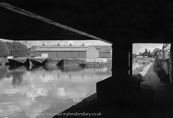 A view from the south end of the covered shed. Although there was very little barge traffic in 1981, one of the lighters is very clearly loaded, floating much lower in the water and with tarpaulin over the load.