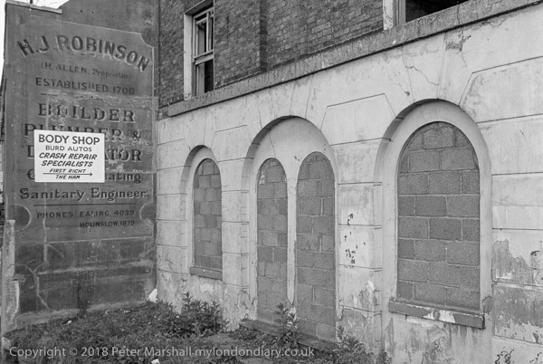 H J Robinson whose advert appears on the wall here, a few yards to the east of Brentford Bridge, were a long-established company in Brentford High St. According to the Brentford High Street Project entry on Number 155:
