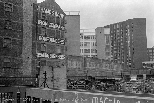 The Thames Bank Iron Company were Ironfounders with premises in Old Jamaica Wharf, Upper Ground on the south bank of the Thames. They moved to North Bank, off Lodge Road, in Lisson Grove where they overlooked the Regents Canal in 1926. The buildings here were demolished around 1994, though a report in the GLIAS newsletter in 2011 suggested that a lower part of the wall may remain.