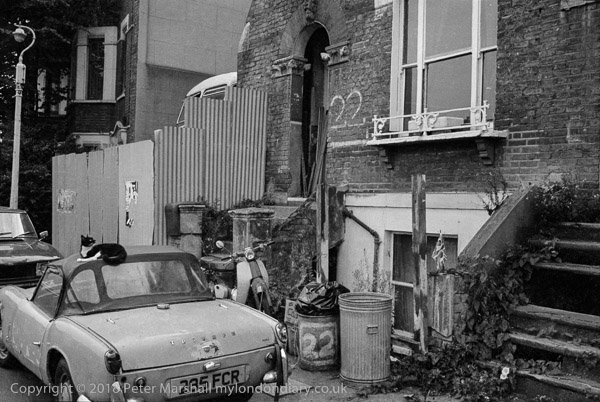 A cat sits on top of a sports car (a Triumph Spitfire Mk 2) outside No 22 St Agnes Place. The car has seen better days, with a broken rear light and rusting around the boot handle. Convolvulus is growing up the steps and other weeds seem well established.