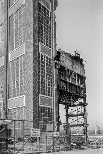 Woolwich Power station was coal-fired and first opened in 1893 as the Woolwich District Electric Lighting Company, but subsequently redeveloped into a large site with three giant chimneys. One was taken down in 1978 and the other two blown up the following year, but parts of the building were still being demolished in 1981.