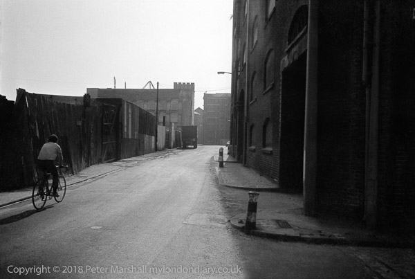 The building at the end of this street is quite clearly GUN WHARVES, a long line of tall six story wharves that line both sides of Wapping High St just west of Wapping Underground Station. The cyclist was going West along Wapping High St, and I was probably standing close to the corner of Clave St.