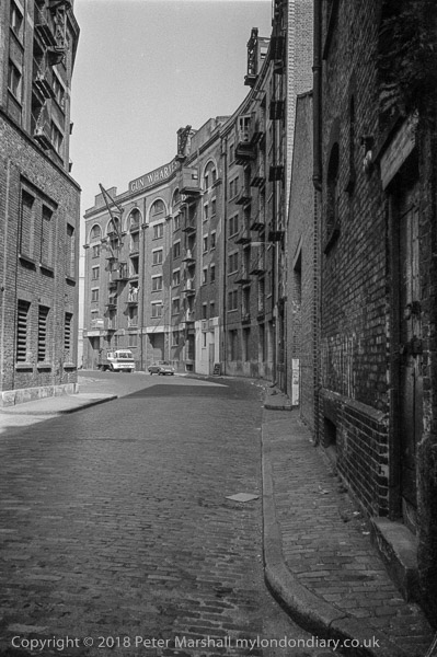 When I was making these pictures in 1981 at least some of the wharf buildings were still in use as warehouses, but shortly after they were all converted to luxury flats. You can just make out a lorry and two men on the second floor watching a load being lowered on to it by the crane operator on the floor above.