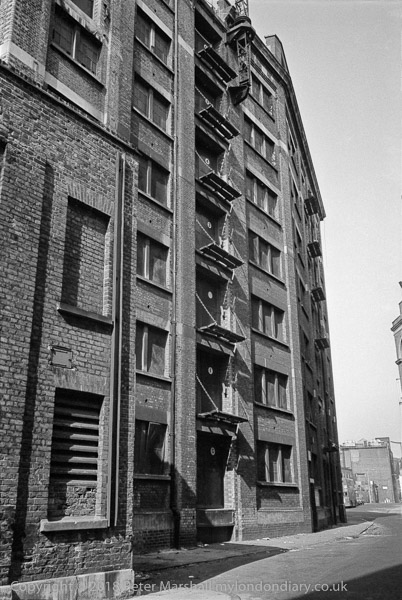 Gun Wharves, Wapping High St, Wapping, 1981 29g-34: street, warehouses, Tower Hamlets,
