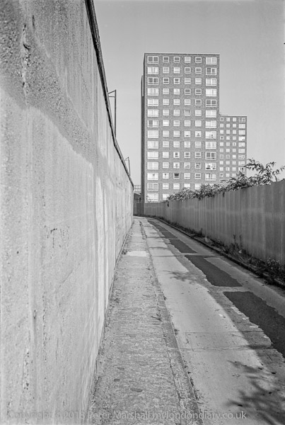 This bleak alleyway was I think somewhere in the Oak Lane/ Newell Street area in Poplar, which was altered dramatically in 1989-1993 by the construction of the Limehouse Link Tunnel. I think it is beside the rail line - which later became the DLR - on the left.