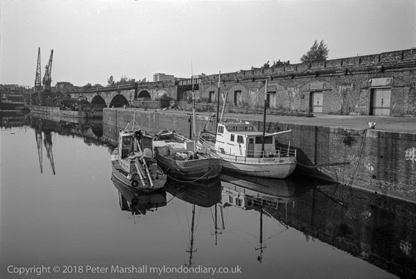 The creation of the London Docklands Development Corporation (LDDC) in 1981, around the time I made this picture, has led to considerable development around the dock, beginning in 1983, and the railway viaduct originally built for the London and Blackwall Railway now carries the frequent trains of the Docklands light railway which allows glimpses of the dock in the gaps between the new flats.