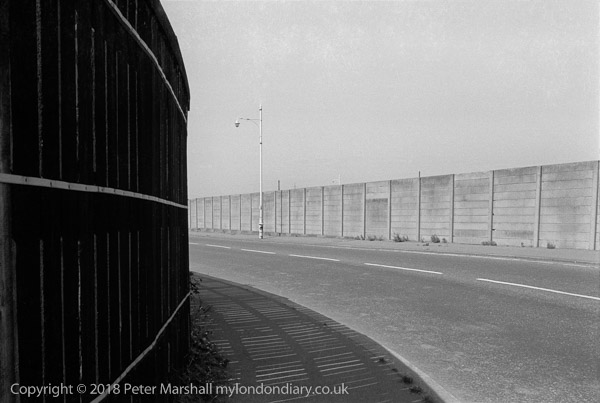 High fencing around the dock areas on both sides of the road gave Woolwich Manor Way a very austere appearance, but was not uncommon in the docks. At least when walking you could peer between the palings on the left hand side, towards the Albert and King George V docks, still just in business when I took this picture, with the last cargo leaving in December 1981.