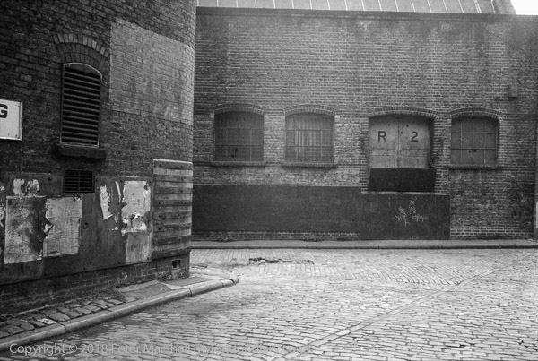 The corner has some iron strips to prevent lorries damaging the brickwork. On the opposite of the road the doors are labelled 'R 2', and is probably a part of the R warehouse of Pickfords Wharf, built as Stave Wharf. On it are the initials by four recent visitors from Ampthill Square in Somers Town. A second frame from a little further back tells me the 'G' at left is simply from a very large 'NO PARKING' sign.