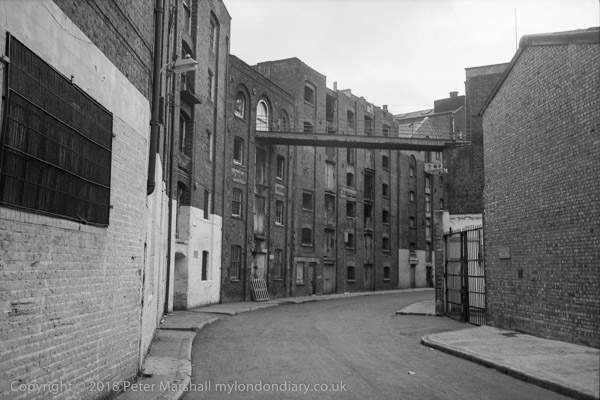 The scene here remains recognisable. The building at left is Java Wharf, which appears to be a pastiche recreation, but Crown Wharf still looks very similar but the first section of St Andrew's Wharf needs rather more imagination to recognise, with some hideous added balconies.
